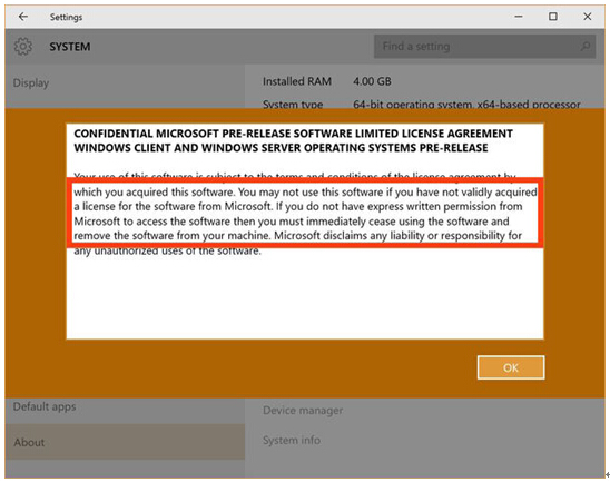 随着恢复的 Windows 10的构建测试人员,微软已经告诉用户他们可能没有运行该软件的权利,又开始打小水印复制品。 微软发布Windows 10版本10525到它的内部人士预览参与者周二四个星期的沉寂后重新启动早看节目,而它推动了生产代码给用户。 在暂停期间,水印识别构建为预览除去。水印现在已经回到了谁安装在Windows 10的预览用户。水印读,“视窗10 Pro的内幕预览。评估副本。建立10525 [加强调。” 更重要的是,微软警告用户,他们可能并不合法。 “你可能不使用这个软件,如果你还没有获得有效的许可证从微软的软件,说:”这似乎当用户点击该链接标记为“阅读Microsoft软件许可条款”,从设置/系统/关于文本。 “如果你没有明确书面许可,微软访问该软件,那么你必须立即停止使用该软件,并从计算机中删除软件”的副本继续[强调]。 缩写许可证的意图是类似于最终用户许可协议(EULA)绑在量产版。 “更新或升级的非正版软件,软件Microsoft或授权来源不使你的原始版本或更新/升级版正品,而在这种情况下,你没有许可使用该软件,”该协议读。 在Computerworld的情况下,新的水印和许可证文本出现在构建10525后的Windows 10是星期二更新从生成10240中安装的磁盘镜像的虚拟机上的Windows 10的副本 - 或.iso文件 - 下载微软的网站。该虚拟机已经被新创建,并内幕预览已经安装从头:换句话说,它不是由从升级被授权有效 Windows 7或8.1许可支持。 其他人也做了同样。 事实上,这种做法一直是相当大的兴趣在六月的焦点,当微软采取了一些尝试来解释那些在预览程序中谁可以继续其7月29日推出后,运行Windows 10。 一锤定音? “最后,我要重申的很清楚了Windows 10,无论你得到它的7/29或是否通过Windows的内幕程序的预览形式得到它,意在[A]正版Windows设备上安装开始,”说加布里埃尔锥子工程总经理微软的操作系统,在6月22日的博客。 “正版”,是微软代言其软件的正版,激活的复制。 “这不是为了它的 Windows XP或Windows Vista系统许可证的路径。如果你的系统从正版Windows 7或Windows 8.1许可升级,它会保持激活状态,但如果没有,您需要回滚到您的以前的操作系统版本或获得一个新的Windows 10的许可。如果你不回滚或获得新的许可证的建设最终将到期,“奥尔补充说。 在大约在同一时间在Twitter上评论,奥尔阐明了什么似乎是一个漏洞,啁啾保证,只要测试持续运行的链接到他们的Microsoft帐户的预发布版本 - 不管它是如何安装 - 视窗10将保持激活。 “这是预发布软件,并与预发行键激活,”奥尔说,内幕初显。 “每一个人的构建将在一段时间后到期,但你会继续接收新的版本,所以的时候,你会收到一个新的旧的预发行版本过期。” 构建10525的Computerworld的副本保持动作,大概是由引用的一种预发布产品的激活码AUL的。 然而,激活不合法的分配,即使有可能不是一个办法微软能够轻松地运行有业内人士预览SANS一个潜在的有效许可证阻止用户。它也可能想:有业内人士既是微软的反馈回路和外部测试方案的一个重要组成部分。