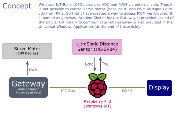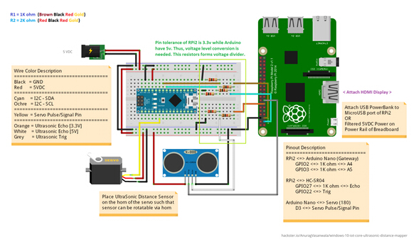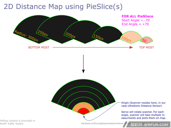 该设备像雷达和激光雷达一样使用超声波和红外进行测量。雷达虽然精准,但使用起来非常贵。因此,可以利用Windows 10 IoT Core开发距离绘制设备,以达到超声波距离传感器(HC-SR04)和伺服雷达一样的效果。 设备简介: 该设备测绘距离,需要旋转传感器,来获取距离在不同层次的二维视图。旋转超声波距离传感器,需要一个伺服并准确地转动它。树莓派2可以旋转伺服到特定的角度来测量距离和绘制成二维视图。但是,目前并不能直接从树莓派2操作伺服,因为Windows IOT Build 10531仅仅提供了ADC和PWM的外接芯片。这意味着从树莓派2我们不能直接控制伺服,它需要额外的元件。我们可以通过Arduino操作伺服。 Arduino可让树莓派2通过I2C总线通信并操作伺服: 软件操作: 这里需要开发两个固件:一个用于Arduino,另一个是树莓派2(UWP)。微软已经正在开发用于Arduino的网关固件,有了此网关固件,将能够直接从Windows IoT代码运行Arduino。这意味着将能够在树莓派2上直接操纵的Arduino的数码,模拟,PWM和串行引脚。但目前微软开发的网关固件Arduino任然存在稳定性的问题。 网关介绍: 网关是指一个I2C从属设备,它服务于树莓派2产生的任务。 通用Windows应用程序: 通用Windows应用程序将通过I2C与网关通信,并需要让网关移动伺服到指定的位置,那么UWApp就可以将测量距离绘制成二维视图。移动伺服后不要立即读取距离数据,因为它需要一定的时间设置伺服到某个特定角度。用特定方向的多个样本可以获得精确的距离读数。由于更高的采样会更准确但同时分辨率会较低(这意味着它需要一定的时间来处理样品),因此我们需要平衡取样和性能。 概要: 在Arduino Nano上发现,如果在I2C上已经实现了分压电路(下图的绿色矩形),树莓派2将无法通过I2C与Arduino Nano通信。可以直接通过I2C连接Arduino Nano和树莓派2 ,虽然树莓派2工作电压为3.3V,而Arduino的工作在5V,但目前还未发现任何副作用。 须知: 安装程序集“WinRT”的“XAML”工具包:它提供了各种预开发的组件,如饼图切片,图表等,你可以找到在其网站上的组件的完整清单。饼图切片是该工具包为这个项目提供的一个关键组成部分。你可以看到饼图切片在文章中呈现的图像。在文章后面,雷达描绘的2D地图画面使用了多个饼图切片组件。 成功安装组件之后,您需要在XAML代码中指定命名空间的别名以使用该组件。例如: xmlns:Shape="using:WinRTXamlToolkit.Controls"