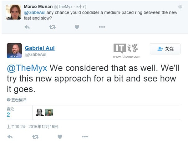 今天微软开启了 Win10新分支Redstone第一波更新(即RS1)的预览测试,为了改进Insider预览体验,微软打算对推送频率进行调整。微软Insider项目负责人Gabe Aul在官方博客中对今后的调整计划做了详细说明。 Gabe Aul 写道: “我从Insider用户听到多次反馈,要求加快Build推送频率。我们已开始针对改反馈做出改进,预计明年1月份我们将加快推送速度。为了做到这一点,我们正在重新评估加快速度的标准。新的推送速度标准将与微软内部测试通道标准更接近,意味着内部测试将会有更多版本通过,Insider快速通道将收到更多预览版。不过同时也意味着快速通道的版本会包含更多Bug,而部分问题可能会让用户感到痛苦,这需要做出一些权衡,这正是我们加快推送速度时所要考虑的标准问题。” “如果你想获取更多预览版,你一定会感到高兴,但如果你对此感到不适,我建议你切换到慢速通道,以获取更加稳定的版本。你可以在设置—更新和安全—Windows更新—高级选项中调整获取预览版的速度。” “我们将始终听取Insider用户的反馈,并持续做出改进。” 有用户可能会问,会不会有介于“超快”和“慢”之间的推送通道呢?Gabe Aul在推特上表示,这个建议也在考虑中。